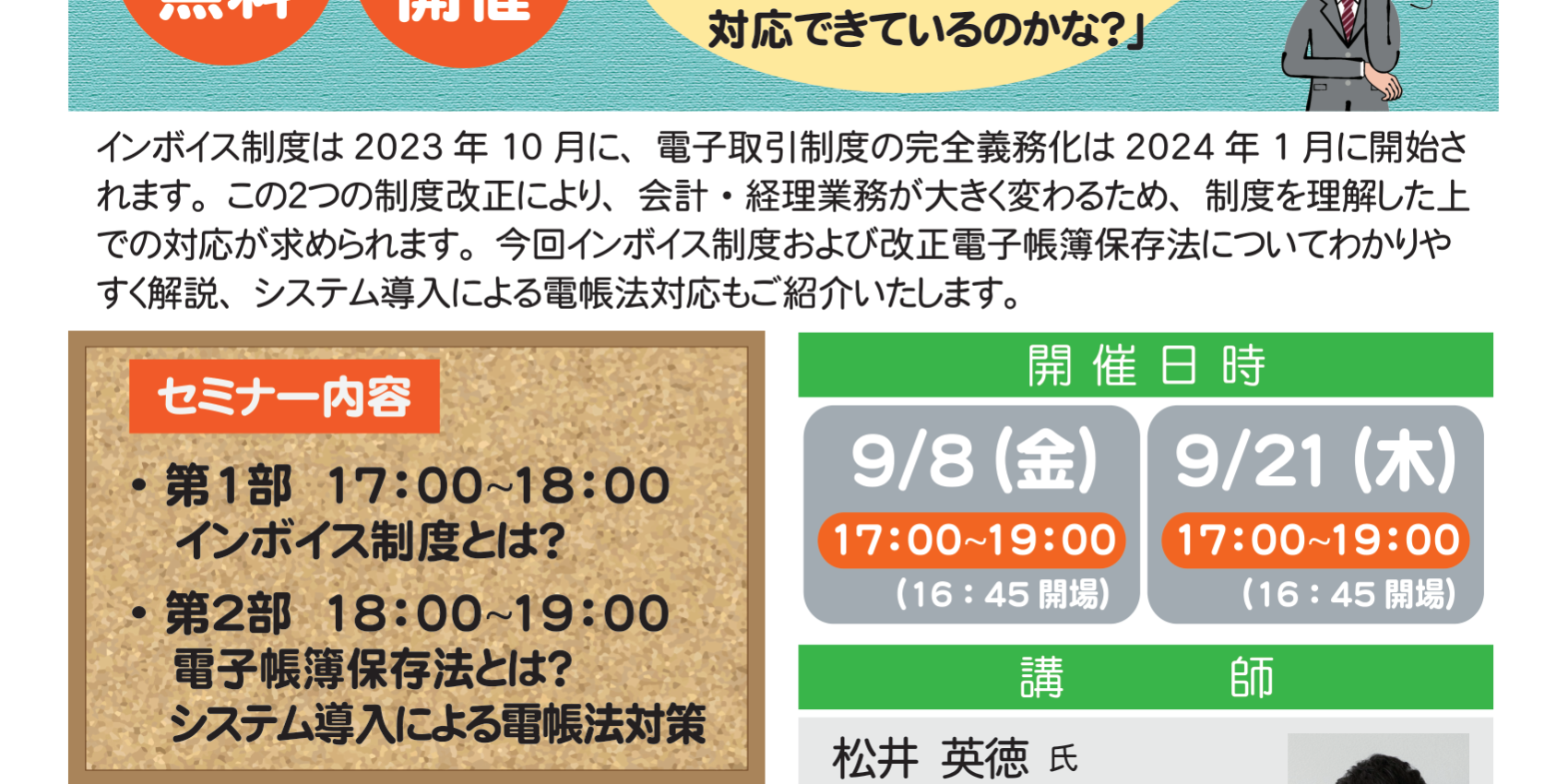 9/8(金)・9/21(木) 施行直前!【「インボイス制度」「電子帳簿保存法」対応セミナー】ZOOM開催